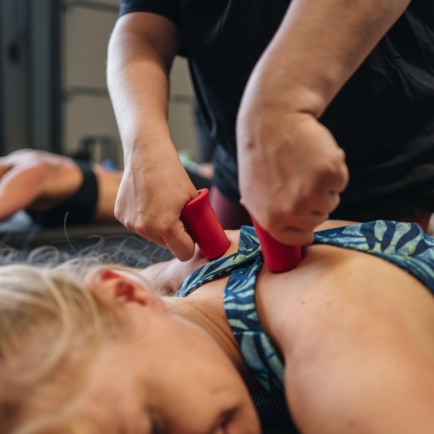 Fascia can also benefit from pressure, as evidenced by the successful use of foam rollers or guns. With the cups you can press very precisely on the fabric - and protect your thumb at the same time.